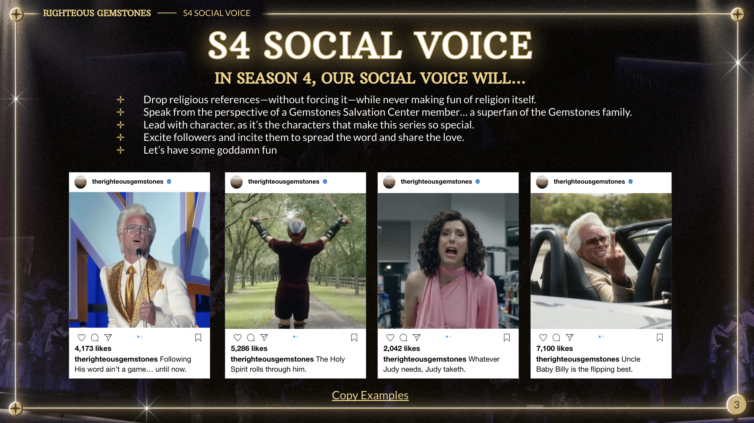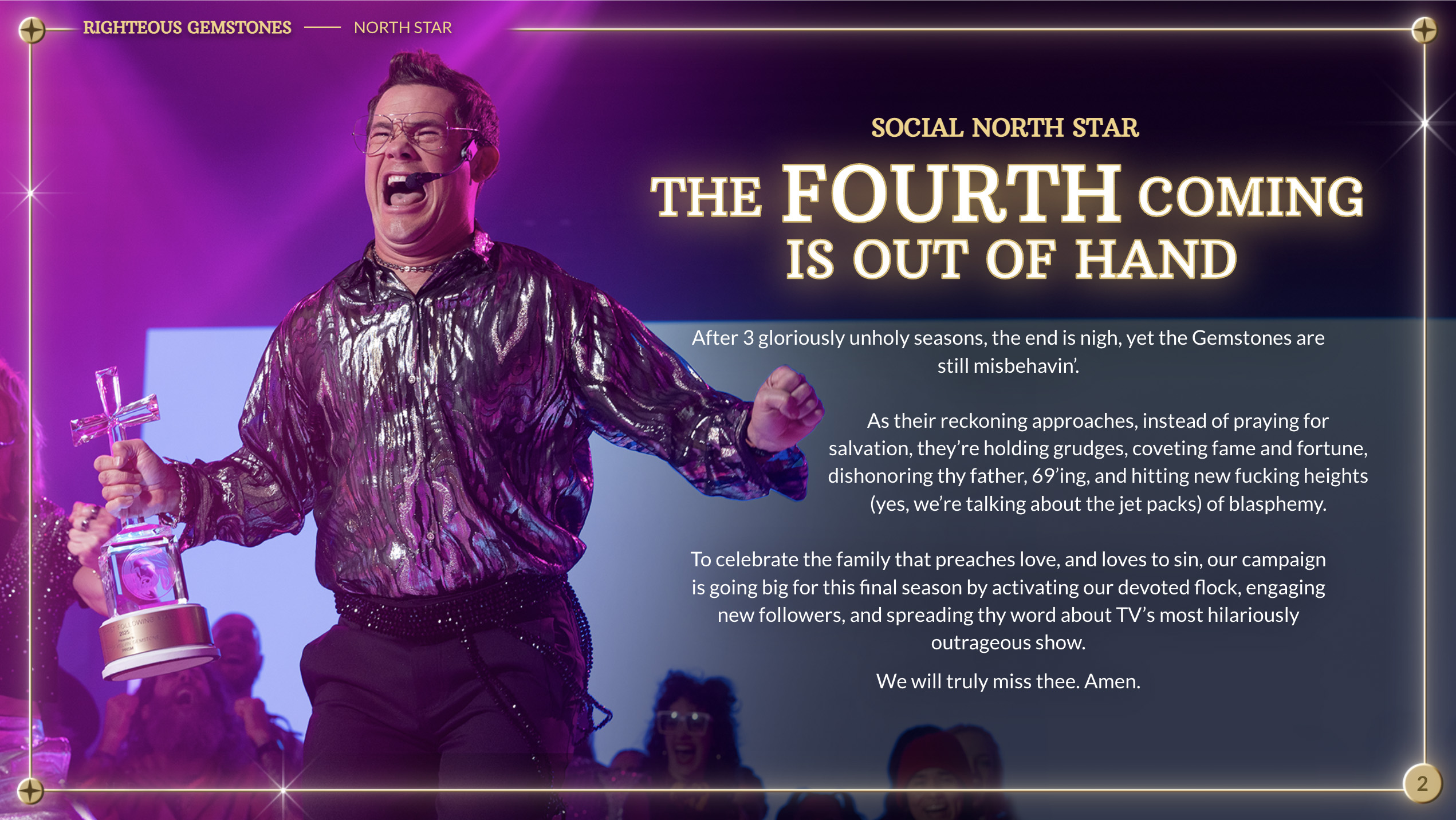 Collaborating with HBO on their hilarious and outrageous comedy (and one of my favorite shows) was a dream come true. With voice and tone being key to the campaign, we pushed boundaries, but never made fun of religion directly.Prayer Pod HotlineThe series focuses on a ridiculous new invention where worshippers would pray on-the-go: the Prayer Pod. We created a phone line for audiences to call and leave prayer messages for the Gemstones. Prayer Pod Hotline Follow-upOnce people left genuine messages, we used them later in the campaign for its own fun social video. Go ahead and call. Don’t forget to leave a message! Gemstones gems-tunesWith so many hilarious songs in the series, we crafted a faux-commercial highlighting some of the family’s greatest tunes. I may have written the script, but that narrator is truly doing the Lord’s work.Starting the campaign with a strategic goal, we wanted this final season to be big, and bold, and not hold anything back.Before working on the campaign, we were told it would be won or lost based on voice, tone, and copy samples. It was stressful, but I had a few divine ideas.