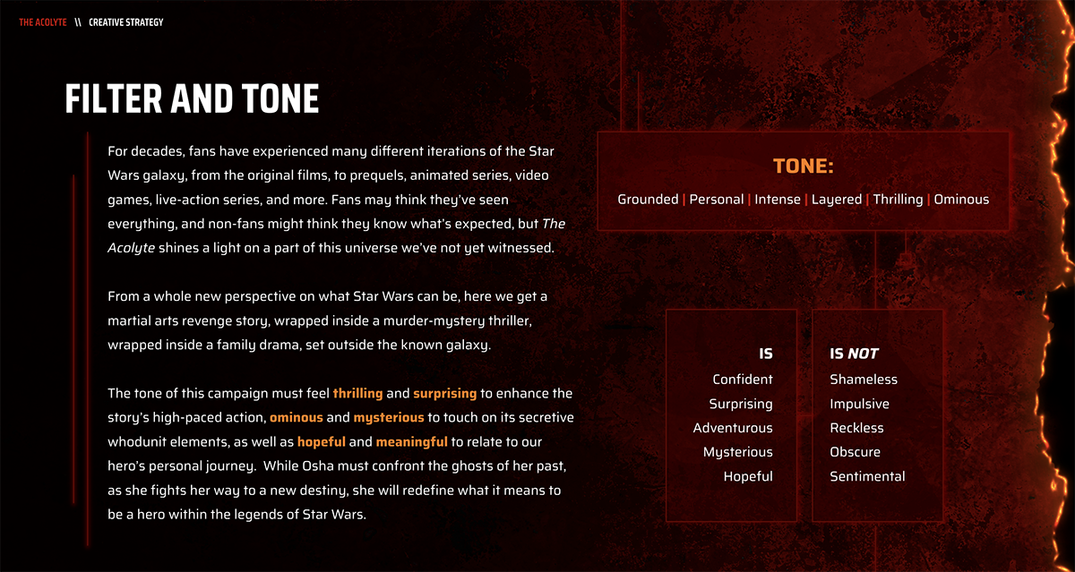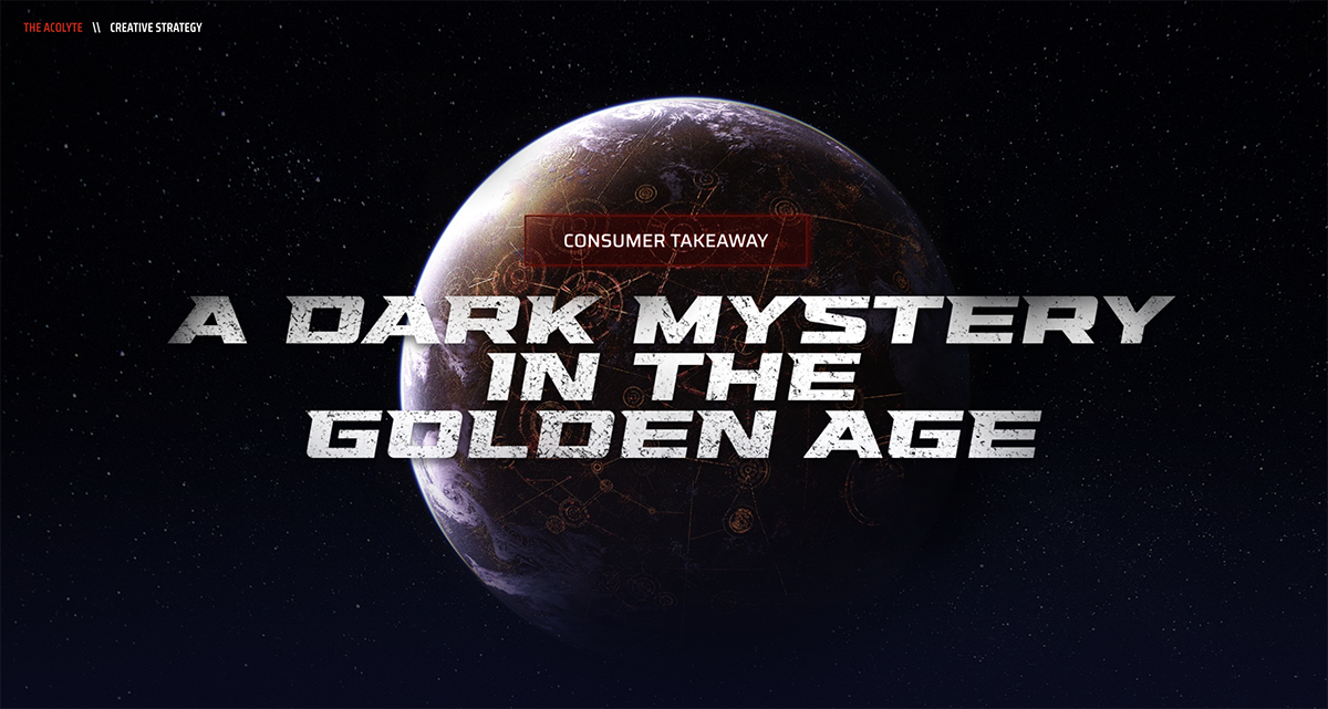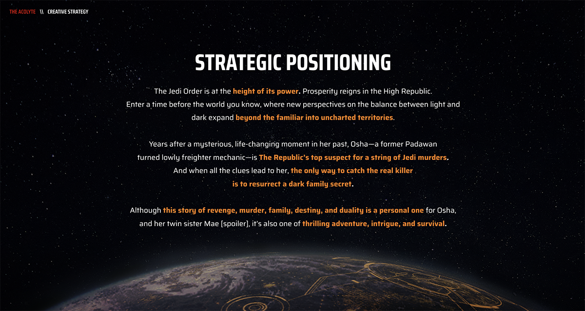Having been a Star Wars nerd my entire life, I’m privileged to have worked on so many different iterations of the epic adventure...Months before Disney announced their new Star Wars section of the theme park, they needed a name for it. With thousands of options, they chose one of mine.The Acolyte: StrategyYears before the series debuted, our team began work on crafting the campaign strategy for Disney’s big series. Reading scripts and collaborating with Disney clients paved the way for the campaign’s direction ahead.The Acolyte: StrategyThe Acolyte: Strategyvolume_offThe Acolyte: TrailerWhen darkness falls on a time of enlightenment for the galaxy, no one is safe from the truthObi-Wan Kenobi: Trailervolume_offThe showdown between Obi-Wan and Darth Vader that no one saw coming… yes please.The Book of Boba Fett: TrailerPretty sure I pitched the finished line of copy on the kick-off call, but I still had to write 50 more options to prove the initial idea was best, haha.volume_off